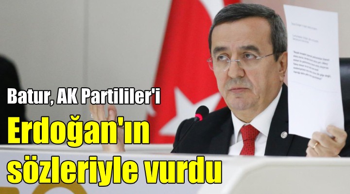 Elindeki kağıttan Cumhurbaşkanı Recep Tayyip Erdoğan’ın bugün sabah düzenlenen Şehir ve Güvenlik Sempozyumu'nda söylediği “Küçük hesaplar yaparsak şehirlerimize ihanet etmiş oluruz. Burada kararlı duruş şart. Dikey mimari ile şehirlerimize ihanet etmiş oluyoruz. Yatay mimari ile bir defa hem kendi medeniyetimizi de inşa etmiş oluruz. Biz göğe değil toprağa yakın olma gayretindeyiz” sözlerini okuyan Batur, AK Parti Grubu'na ve Hakan Yıldız'a dönüp, "Bu sözleri ben söylemiyorum. Sizin Genel Başkanınız ve ülkenin Cumhurbaşkanı söylüyor. Ne diyor! Kararlı duruş şart diyor. Tamam işte biz kararlıyız, şehre ihanet etmemek için uğraşıyoruz. Kararlı duruşumuzu sonuna kadar sürdüreceğiz. Siz de bari kendi liderinizin fikrine sahip çıkın” dedi.