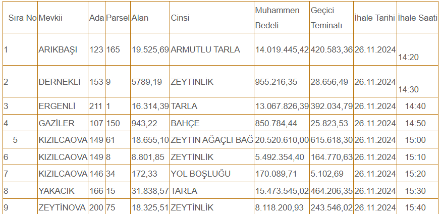 SONKALEİZMİR - Davut Sakarsu yönetimindeki Bayındır Belediyesi, 9 parseli satışa çıkardı. Armutlu tarla, zeytinlik, bahçe, zeytin ağaçlı bağ ve yol boşluğu vasfındaki araziler için 170 bin TL ile 20 milyon 520 bin TL arasında değişen muhammen bedeller belirlendi.