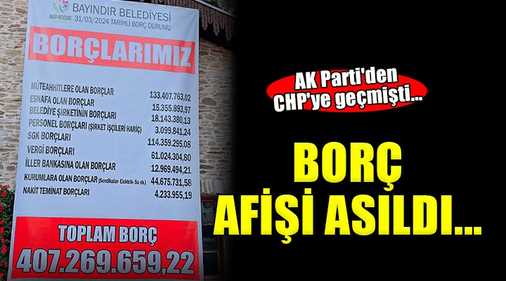 SONKALEİZMİR-Bayındır'da yerel seçimi kazanan CHP'li Davut Sakarsu, belediyenin ekonomik durumu ile ilgili afiş yaptırıp hizmet binasına astırdı. Sakarsu'dan önce AK Partili Uğur Demirezen'in yönettiği belediyenin toplam borcu 407 milyon 269 bin 659 TL olarak duyuruldu.