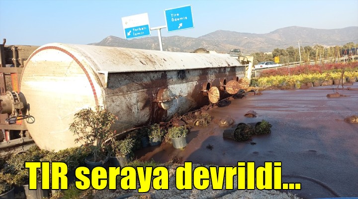 Tokatbaşı mevkisinde Recep B. yönetimindeki 35 AOV 518 plakalı TIR, sürücünün direksiyon hakimiyetini kaybetmesi sonucu yoldan çıkarak çiçek serasına devrildi.