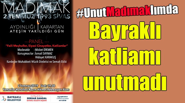 Bayraklı Belediyesi, 2 Temmuz 1993’te Sivas Madımak oteldeki yangında katledilen aydınlar ve sanatçılar için anma etkinliği düzenledi. Bu kapsamda İzmir Gazeteciler Cemiyeti Başkanı Misket Dikmen’in moderatörlüğünde Gazeteci-Yazar İsmail Saymaz ve Şair-Yazar Hidayet Karakuş’un katılacağı panel, müzik dinletisi ve semah gerçekleştirilecek. 2 Temmuz’da Yamanlar Nazım Hikmet Rekreasyon Alanındaki etkinlik saat 19:30’da başlayacak.