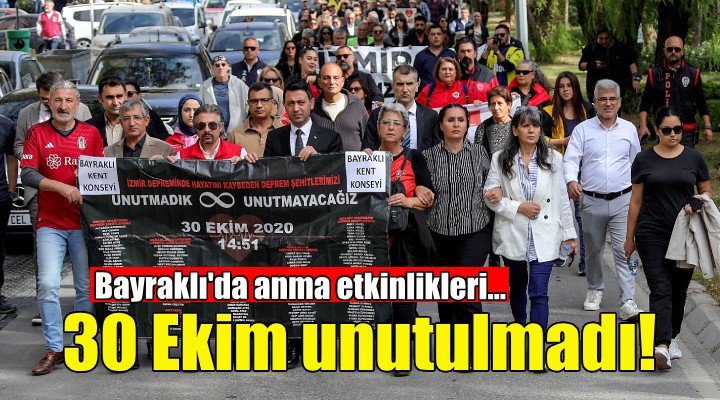 Bayraklı Belediye Başkanı İrfan Önal da Özkanlar’dan Hasan Ali Yücel Parkı’ndaki 30 Ekim Deprem Anıtı’na kadar depremzedelerle birlikte yürüdü. İzmir Büyükşehir Belediyesinin anma etkinliğinde hayatını kaybedenler anısına saygı duruşunda bulunuldu, anıta karanfiller bırakıldı. Etkinliğe İzmir Büyükşehir Belediye Başkanı Cemil Tugay, CHP İl Başkanı Şenol Aslanoğlu, ilçe belediye başkanları, İzmir Depremzedeleri Dayanışma Derneği (İZDEDA) Başkanı Bilal Çoban, sivil toplum kuruluşları, depremzedeler ve yakınları katıldı.