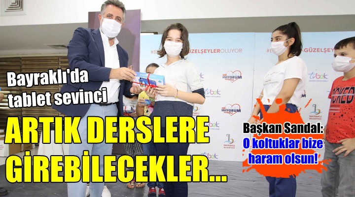 Adaylık sürecinde verdiği sözün arkasında olduğunu belirten Başkan Sandal, "Bayraklı'da bir ailemizin ekonomik durumu veya farklı nedenlerden dolayı eğitimini aksatan çocuğu varsa biz bu çocuğumuza Bayraklı Belediyesi olarak sahip çıkacağız. Bir çocuk; imkanları kısıtlı diye okuluna gidemiyorsa ve biz de bu çocuğumuza el uzatmıyorsak bu koltuklar bize ve tüm bürokratlarımıza haram olsun. Sonuç olarak, çocuklarımız ve gençlerimizin geleceğine yönelik yaptığımız çalışmaların tamamı yine Bayraklılı yurttaşlarımız tarafından karşılanıyor. Bir kamu kurumunun yapması gereken bir iş olarak size dönüyor. Bugün size tablet alıp, dağıtırken bunun içinde vatandaştan, kamudan topladığımız vergi gelirleri var. Toplanan bu her kuruşun yine ilçe sakinimizin hizmetine sunmak ile ilgili çaba içindeyiz. Bu bizim görevimiz ve herkes de bu sorumluluk bilinciyle hareket etmeli. Çocuklarımızın gözlerine bakıyorum. Hepsinin gözleri ışıl ışıl, pırlanta gibi çocuklar. Siz velilerimizi de ayrıca kutluyorum. Eğitim, öğretimin bir hak olduğunu ve eğitimlerini tamamlamaları noktasında çocuklarınız için elinizden geleni yaptığınız için sizlere şükranlarımı sunuyorum. İyi ki varsınız. Bu ülke kalkınacaksa, bir noktaya gelecekse sizler sayesinde, çocuklarımız sayesinde olacak. Biz çocuklarımızı desteklediğimiz, imkanlarını karşıladığımız sürece çocuklarımız ışıl ışıl parlayacak. Buna aracılık yaptığınız için hepinize teşekkür ediyorum" diye konuştu.