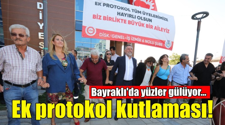 Bayraklı Belediyesinde geçtiğimiz haftalarda mutlu sonla biten ek protokol görüşmelerinin ardından imzalanan toplu sözleşme, davullu zurnalı etkinlikle kutlandı. Belediye binası önündeki etkinliğe Başkan Serdar Sandal’ın yanı sıra DİSK Ege Bölgesi Temsilcisi Memiş Sarı, Disk Genel İş 6 No’lu Şube Başkanı Değer Yıldız, sendika temsilcileri, meclis üyeleri, muhtarlar ve belediye işçileri katıldı. 1214 işçinin maaşlarında iyileştirme yapılan ek protokolle en düşük çalışan maaşı 18 bin TL’den, 22.466 TL’ye yükseltilmişti.