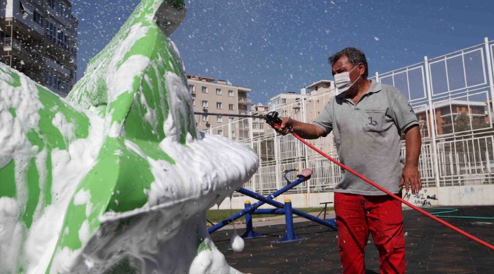 “Çocuk ve Gençlik Kenti Bayraklı” sloganıyla çalışmalarını sürdüren Bayraklı Belediyesi, ilçeyi çocuklar için daha sağlıklı ve yaşanabilir hale getiriyor. Belediyenin Park ve Bahçeler Müdürlüğü, bu amaçla çocuk parklarında temizlik çalışmalarına başladı. Ekipler, önce parklardaki oyun grupları üzerine sprey boyayla yazılan yazıları zararlı kimyasal içermeyen jel ve tazyikli suyla temizledi. Ardından yeniden sabunlanıp yıkanan oyun grupları, durulanarak kullanıma uygun hale getirildi. Çevre sakinleri de, yapılan hizmetten çok memnun olduklarını dile getirerek, “Parkımız tertemiz oldu. Artık çocuklarımızı gönül rahatlığıyla parka getiriyoruz” dedi.