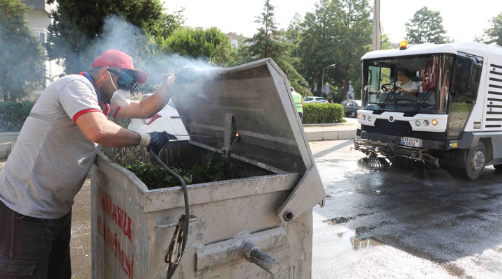 Bayraklı Belediyesi yaz sıcaklarının artmasıyla birlikte oluşabilecek çöp konteynerleri kokularının önüne geçmek için yıl boyunca sürdürülen temizlik çalışmalarını hızlandırdı. Bu kapsamda Temizlik İşleri Müdürlüğü ekipleri, her gün ilçenin 24 mahallesinde belirlenen program dahilinde konteynerlerin bakım, onarım ve boyasını yapıyor. Özel temizleme aracı ile baştan aşağı steril hale getirilen konteynerler yıkanıp, olası koku ve kötü görüntünün de önüne geçiliyor. Eskiyen konteynerler değiştirilirken, haşerelerin artmasına karşı da önlemler alınıyor.