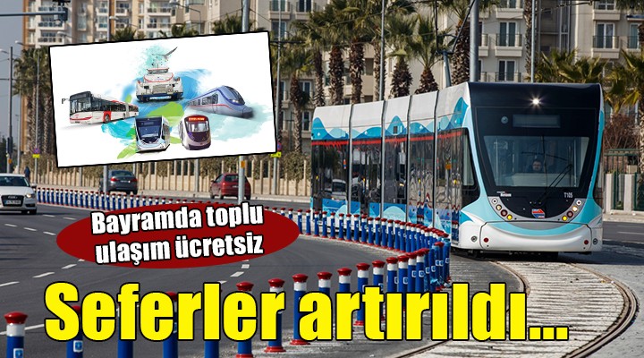 İzmir Metrosu, bayram günleri boyunca 06.00 – 12.00 saatleri arasında 7,5 dakikada bir, 12.00 – 20.00 saatleri arasında 6 dakikada bir, 20.00 – 00.20 saatleri arasında ise 7,5 dakikada bir hizmet verecek. Karşıyaka Tramvayı 06.00 – 07.00 saatleri arasında 15 dakikada bir, 07.00 – 00.20 saatleri arasında ise 10 dakikada bir hizmet verecek. Konak Tramvayı ise 06.00 – 00.20 saatleri arasında 7,5 dakikada bir hizmet verecek.