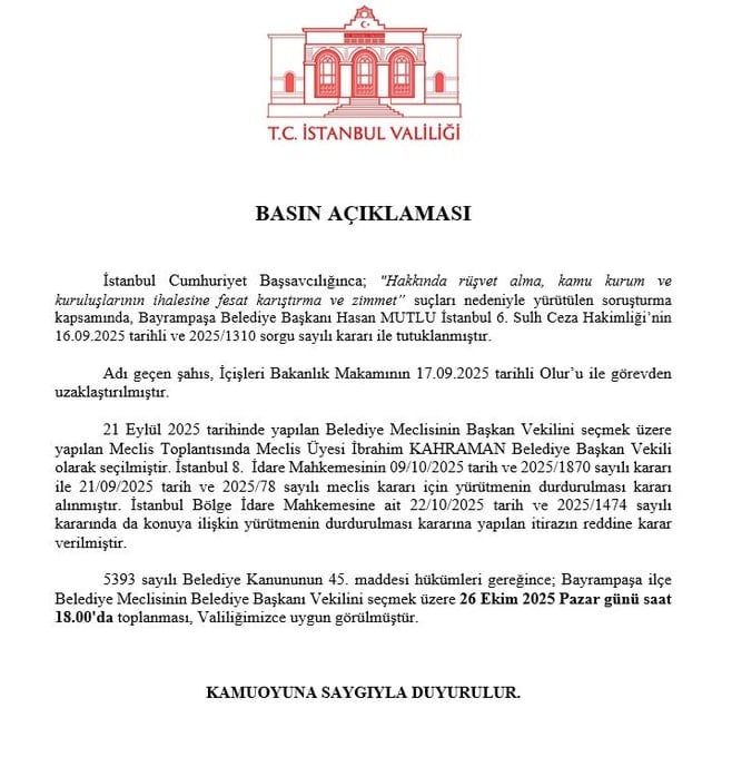 İstanbul Valiliği, "Bayrampaşa ilçe Belediye Meclisinin Belediye Başkanı Vekilini seçmek üzere 26 Ekim 2025 Pazar günü saat 18:00'de toplanması, Valiliğimizce uygun görülmüştür" açıklamasında bulundu.