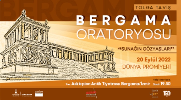 Bergama’nın köklü mirasının tüm dünyaya doğru anlatıldığında Zeus Sunağı’nı geri getirme talebinin karşılık bulabileceğini söyleyen İzmir Büyükşehir Belediye Başkanı Tunç Soyer, sanatın evrensel gücünü harekete geçirmek üzere önemli bir adım attı. 1869-1878 yılları arasında kaçak kazılarla Bergama Antik Kenti'nden yurt dışına kaçırılan Zeus Sunağı’na atfen 21. Dönem İzmir Milletvekili ve eski Kültür Bakanı Suat Çağlayan’ın İngilizce kaleme aldığı iki şiirden ilhamla besteci ve orkestra şefi Tolga Taviş tarafından bestelenen, Devlet Opera ve Balesi Genel Müdürlüğü dramaturgu Gülümden Alev Kahraman tarafından librettosu yazılan Bergama Oratoryosu “Sunağın Gözyaşları” eseri 20 Eylül’de saat 19.30’da dünya prömiyerini yapacak.