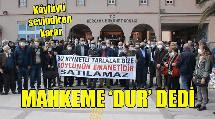 Bütünşehir Yasası’yla birlikte mülkiyetleri Bergama Belediyesi'ne devredilen verimli tarım arazilerinin satışa çıkarılmasına ilişkin İYİ Parti Bergama İlçe Yönetimi tarafından açılan iptal davasında, İzmir 3. İdare Mahkemesi yürütmeyi durdurma kararı verdi. Toplam 831 bin 938,56 metrekare tarım arazisinin satışına ilişkin alınan karar köylünün tepkisine neden olurken, CHP ve İYİ Parti Bergama Adliyesi’ne giderek kararla ilgili İzmir İdare Mahkemesine iptal için dava açmıştı. Bergama Demokrasi Platformu öncülüğünde ise yöre köylüsü adına muhtarlar, kararın iptali için yargıya başvurmuştu.
