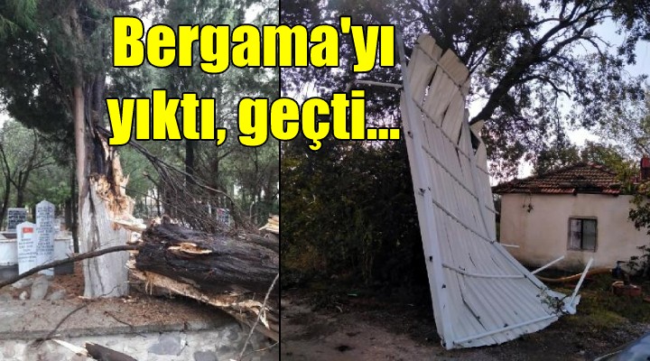 Bergama'da dün öğle saatlerinde başlayan yağmur, ilerleyen saatlerde yerini gök gürültülü sağanağa bıraktı. Sağanakla birlikte etkili olan fırtına, yaşamı olumsuz etkiledi. Cadde ve sokaklar göle dönerken, Zağnos Mahallesi'nde fırtına nedeniyle 30 ağaç ile 2 elektrik direği devrildi. Ağaçlar, 2 evde hasara neden oldu. Ayaskent Mahallesi'nde ise bazı evlerin çatıları uçarken, ekili alanlar zarar gördü, 10 ağaç devrildi. Fırtına nedeniyle Aziziye Mahallesi'nde ise elektrik kesintileri yaşandı.