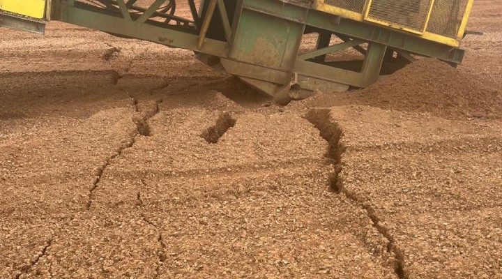 Fotoğraflarda, yığın liç alanında biriktirilen topraklarda derin yarıkların oluştuğu görülüyor.