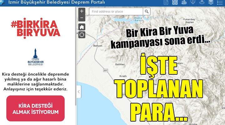 İzmir’i sarsan depremin ardından depremzedeleri ve onlara destek olmak isteyenleri bir araya getiren “Bir Kira Bir Yuva” kampanyasında sona gelindi. Kampanya kapsamında taahhüt edilen kira desteği 42 milyon 649 bine ulaştı. 4 bin 643 destekçi tarafından depremde evsiz kalan ailelere toplamda 20 milyon 510 bin TL aktarıldı. Depremzedelere kapıları açılmak üzere bildirilen daire sayısı da 231'i buldu. Kampanyadan faydalanmak isteyen depremzedelerle onlara destek olmak isteyenler arasındaki eşleştirmeler ve 10’ar bin TL’lik ödemeler sürüyor.