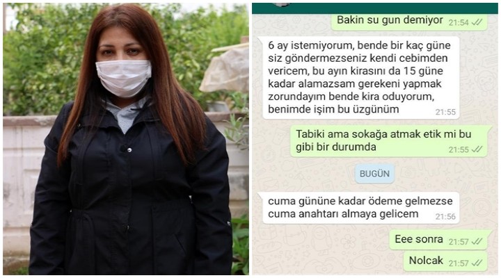 "Gündelik ev temizliklerine gidiyorum. 15 Mart'a kadar düzenli olarak çalışmaya devam ettim. Bir süre sonra yasaklar başlayıp, önlemler alınınca insanlar işleri iptal etmeye başladı. Aynı süreçte bacağı kırılan kızım ameliyat oldu. O nedenle de bir süre çalışamadım. Bu sürece kadar kiramı düzenli olarak ödüyordum. Bu ay kiramı ödeyemedim. Emlakçı beni sürekli 'ne zaman ödeyeceksin' diye aramaya başladı. Durumu kendisine izah etmeye çalıştım. Bu sorunun dünya genelinde yaşandığını söyledim. Buna rağmen her gün aramaya devam etti. Son olarak beni evden atlamakta tehdit etti. Bu durum beni ve çocuğumu psikolojik olarak etkiledi. Kızım, 'Anne sokağa mı düşeceğiz' diye soruyor. Geçimimi sağlayabilmek için çocuğumu hasta halde bırakıp işe gittiğim zamanlar oldu. Kronik astım hastasıyım buna rağmen çalışmaya çalıştım ama artık çaresiz kaldım."