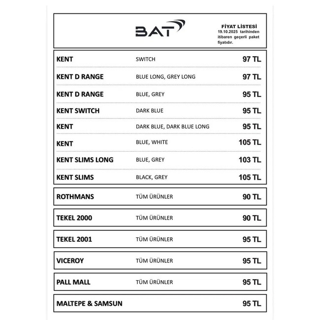 Gelen zamla birlikte BAT grubunun en ucuz sigarası 90 TL olurken en pahalı sigarası ise 105 TL'ye yükseldi.