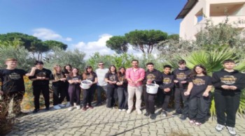 Okul bahçesinde öğrencilerden zeytin hasadı