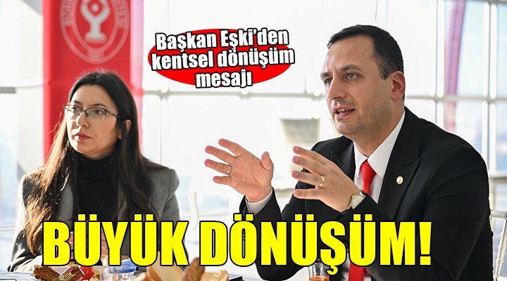 Kentsel dönüşüm çalışmalarında ilk olarak Evka-3, Doğanlar ve Naldöken mahallelerinden adım atılacağını belirten Başkan Eşki, "İzmir Büyükşehir Belediyesi ile birlikte, Türkan Özilhan Devlet Hastanesi’ni merkez alarak çevresini kapsayan geniş bir dönüşüm alanı oluşturduk. Projenin ikinci aşamasında ise Batıçim ile birlikte Naldöken’in tamamı dönüşüme girecek. Hem Bornova’nın çehresini, hem de bölgenin kaderini değiştirecek ve gelecek nesiller için daha yaşanabilir bir kent oluşturacak bir proje hazırlandı. Bornovalılar 40 yıl sonra bile arabalarını rahatça park edebilecek, yeşil alanlarda vakit geçirebilecek, pazar yerlerine kolayca ulaşabilecek, güvenli ve modern bir çevrede yaşayacaklar” diye konuştu.