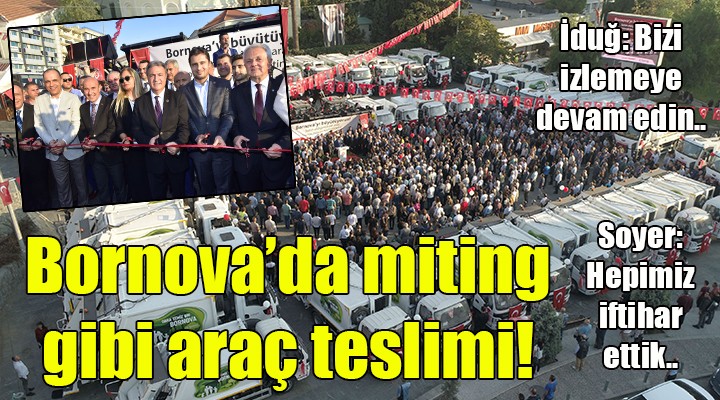 Alkışlar arasında kürsüye gelen Başkan Tunç Soyer ise "Mustafa başkanı eskiden tanıyorum. İyi bir iş adamıydı, başkanlığını merak ediyordum. Yani bugün görüyorum ki olağanüstü, son derece kıymetli bir işe imza attı. Hepimizin iftihar edeceği bir başlangıç yaptı. Bu 68 araç pırıl pırıl Bornovalılar'a hizmet edecek. Hem de önemli bir tasarrufun altlığı olacak. Bu olağanüstü girişimi ve iradesi nedeniyle sevgili Mustafa başkanı tüm kalbimle kutluyorum. Bu tüm İzmir'e, Türkiye'ye örnek olur. Türkiye'nin her yerinde belediye başkanları bu iradeyi ortaya koyarlar. Hem tasarrufu hem de kaliteli hizmeti ortaya koyarlar. Bugün zaten sanki seçim kampanyasının şaşalı günlerinden birindeyiz gibi hissettim. Hayırlı uğurlu olsun" diye konuştu.