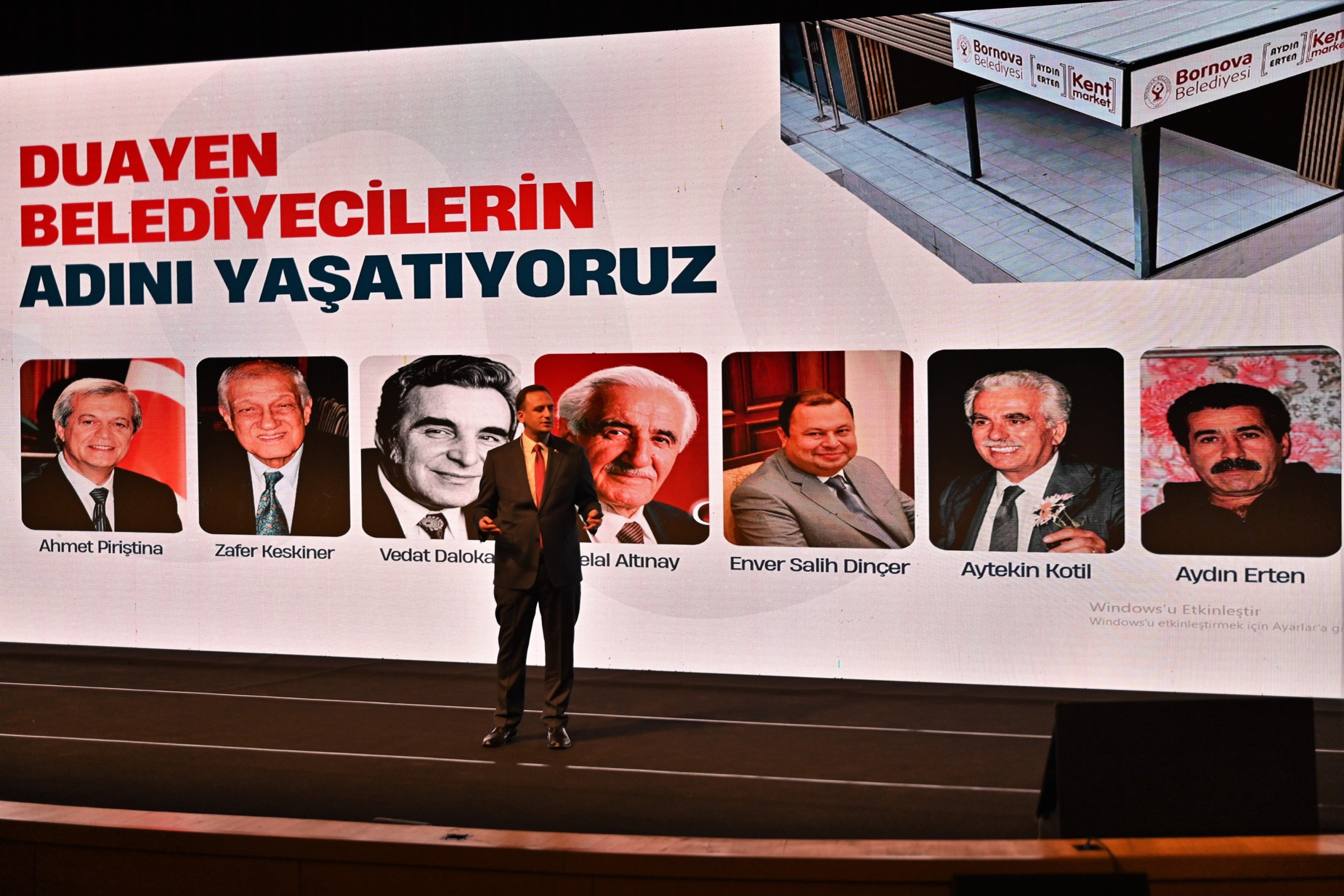 Bornova Belediye Başkanı Ömer Eşki, sahnede tam 66 dakika süren sunumunda iki yıllık çalışmaları anlattı. Eşki, Bornova’yı kentsel dönüşüm, yeşil dönüşüm ve dijitalleşme ekseninde geleceğe taşıdıklarını vurguladı. Önümüzdeki 5-10 yıl içinde tüm belediyeler için bu süreçlerin belirleyici olacağını vurgulayan Eşki, Bornova’nın bu alanlarda öncü olmasını istediklerini ifade etti.