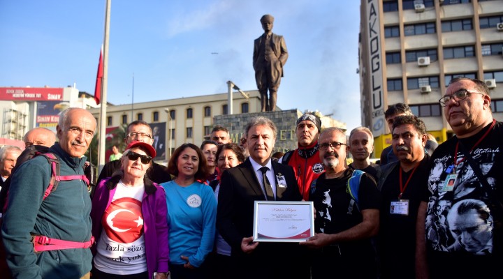 Türkiye Dağcılık Federasyonu İzmir İl Temsilcisi Siyami Çetin’e teşekkür belgesi veren Bornova Belediye Başkanı Dr. Mustafa İduğ, “Burada görüldüğü gibi, Türk milletinin Atatürk’e olan sevgisi geçen her gün daha da artmakta, değeri; özellikle son yıllarda daha iyi anlaşılmaktadır. Bugün yeşil ve güzel Bornovamız sınırlarındaki 8 parkurda Büyük Önderimizin hatırası için yürüyoruz ama bilinmelidir ki; Türk Milleti olarak her zaman Atamızın yolunda yürümeye devam edeceğiz. Devrimlerinin bekçisi olacağız. O’nun izinde, akıldan ve bilimden taviz vermeden Cumhuriyetimizi sonsuza dek yaşatacağız. Sevgi, saygı ve özlemle anıyoruz” dedi.
