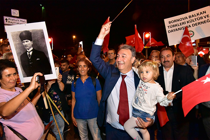 Binlerce Bornovalı’nın katıldığı fener alayı coşkusu, Mustafa Kemal Caddesi boyunca katılanlarla büyüdü. Bornova Belediye Başkanı Dr. Mustafa İduğ ve CHP İzmir Milletvekili Atila Sertel’in eşleriyle katıldığı yürüyüşte siyasi partilerin ve sivil toplum kuruluşlarının temsilcileri de yerlerini aldı. Dev Atatürk posteri ve Türk Bayrağı’nın en önde elllerde taşındığı yürüyüşte renkli görüntüler de oluştu. Küçük bir kız çocuğunun bando takımına şeflik yaptığı anlar büyük ilgi uyandırırken, Bornova Selanikliler Kültür ve Dayanışma Derneği Gençlik Kolları üyesi çocukların İstiklal Marşı’nı ezberden okuduğu anlar Cumhuriyet Meydanı’nda büyük coşku yaşattı.