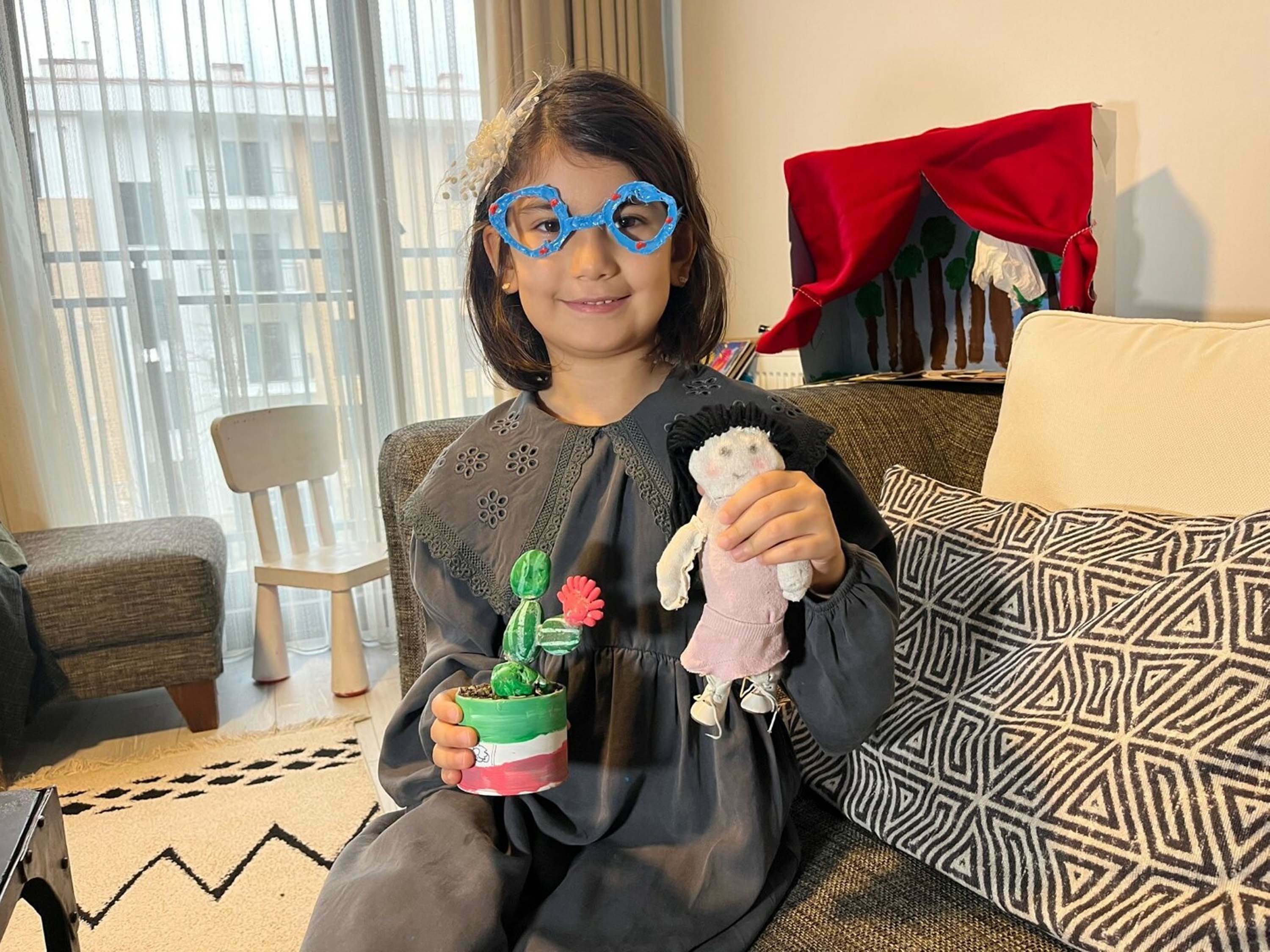 Eski çorap, karton, atık kumaş, metal teller ve taşlar gibi birçok malzemeyi değerlendirdiklerini ifade eden Şakar, "Evimiz için dekor, Flora için oyuncak, mumluk, heykel, kedimiz için ise ev yaptık. Örneğin 'Fındık Kıran' kuklasını Flora çok beğenmişti ve almak istiyordu ancak fiyatı biraz yüksek geldi. 'Biz bunu kendimiz yapabiliriz' dedik. Tamamladığımızda beklediğimizden de güzel oldu. Kendimiz yaptığımız için daha kıymetli oldu. Çocukların motor becerilerinin gelişiminin beyin gelişimine de katkı sağladığını gördüm. Bu yüzden hem eğlenceli hem de çok yararlı bir şey yaptığımızı fark ettik. Ben de eskiden yaptığım bebekleri sakladım, şimdi kızıma örnek olsun diye gösteriyorum" ifadelerini kullandı.