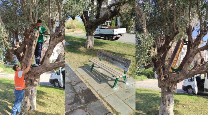 Kuşadası Belediyesi Park ve Bahçeler Müdürlüğü ekipleri, Davutlar Mahallesi’nde bulunan Satı Kadın Parkı’nda sabah saatlerinde bakım ve onarım çalışması başlattı. Bu sırada ekipler, parktaki ahşap banklardan birinin yerinde olmadığını fark etti. Parkın çevresini arayan ekipler, bankı bir zeytin ağacının dalları arasında buldu. Bank, yaklaşık 15 dakikalık çalışmanın sonucunda ağaçtan indirilerek tekrar yerine monte edildi. Herkesi şaşkına çeviren olay, kentin farklı noktalarında her gün zarar verilmiş oyun grupları ve kent mobilyalarını tamir eden Park ve Bahçeler Müdürlüğü ekiplerine ‘bu kadarına da pes” dedirtti. Kuşadası Belediyesi yetkilileri, vandalların neden olduğu düşünülen olayın sorumlularının bulunması ve gerekli cezayı alması için konunun sonuna kadar takipçisi olacaklarını belirtti.
