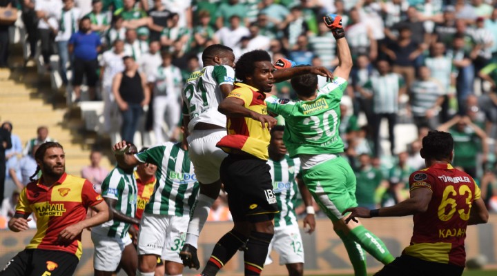 Spor Toto Süper Lig'de kümede kalma yarışını yakından ilgilendiren maçta Göztepe deplasmanda Bursaspor ile golsüz berabere kaldı. Sarı-kırmızılılar puanını 35'e çıkarırken, Timsahlar 34 puana ulaştı. Ligde 32 puanlı Erzurumspor yarın Fenerbahçe'yi konuk edecek. Son haftada ise Göztepe-Ankaragücü, Malatyaspor-Bursa, Kayseri-Erzurumspor karşılaşmaları kümede kalan takımı belirleyecek. 11. dakikada Göztepe’nin golü Video Yardımcı Hakem’e (VAR) takıldı. Berkan’ın sol çaprazdan kullandığı serbest vuruşta topa yükselen Alpaslan kafayla fileleri sarstı. Göztepeli futbolcular büyük sevinç yaşarken, hakem Mete Kalkavan’ın VAR odasından gelen uyarının ardından golü ofsayt gerekçesiyle iptal etti. 19. dakikada Bursaspor gole çok yaklaştı. Sağ kanattan Shehu’nun ortasında Umut Nayir kafayı vurdu. Göztepe kalecisi Beto meşin yuvarlağı son anda kornere çeldi. 20. dakikada Onur’un kullandığı kornerde bu kez Chedjou kafayı vurdu, top uzak direğin dibinden oyun alanını terk etti.