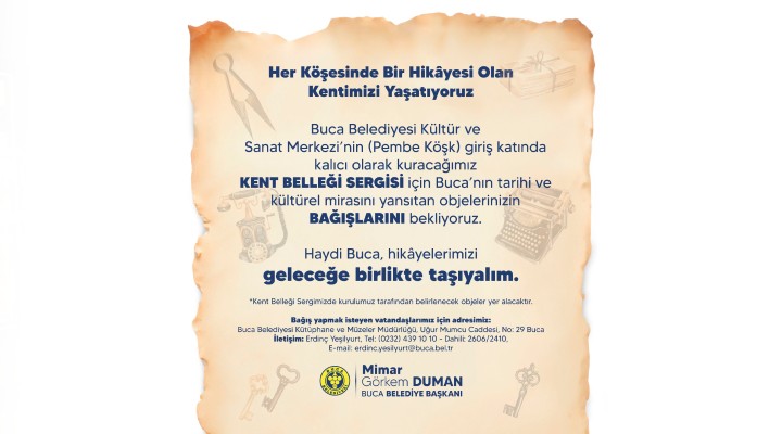 Buca Belediyesi, ilçenin tarihi ve kültürel mirasını yansıtan nesnelerin yer alacağı Kent Belleği Sergisi için çalışmalara başladı. Buca Belediyesi Kültür ve Sanat Merkezi’nin giriş katında kalıcı olarak yer alacak sergiye bağışta bulunmak isteyenlerin, objelerini Uğur Mumcu Caddesi numara 29 adresindeki Kütüphane ve Müzeler Müdürlüğü’ne teslim edebileceği belirtildi.