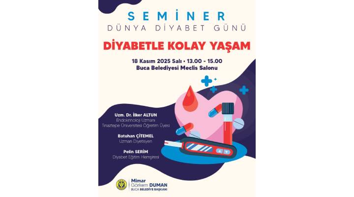 Toplum sağlığı konusunda ilçeye değer katan çalışmalarıyla öne çıkan Buca Belediyesi, Dünya Diyabet Günü kapsamında “Diyabetle Kolay Yaşam” semineri gerçekleştirecek. Buca Belediyesi Meclis Salonu’nda saat 13.00’te başlayacak etkinliğe Tınaztepe Üniversitesi Öğretim Üyesi Endokrinoloi Uzmanı Doktor İlker Altun, Uzman Diyetisyen Batuhan Çitemel ve Diyabet Eğitim Hemşiresi Pelin Serim konuşmacı olarak katılacak. Seminerde, diyabetle mücadelede atılacak önemli adımlar, sağlıklı yaşam tarzı ve bilinçli beslenme konuları masaya yatırılacak.