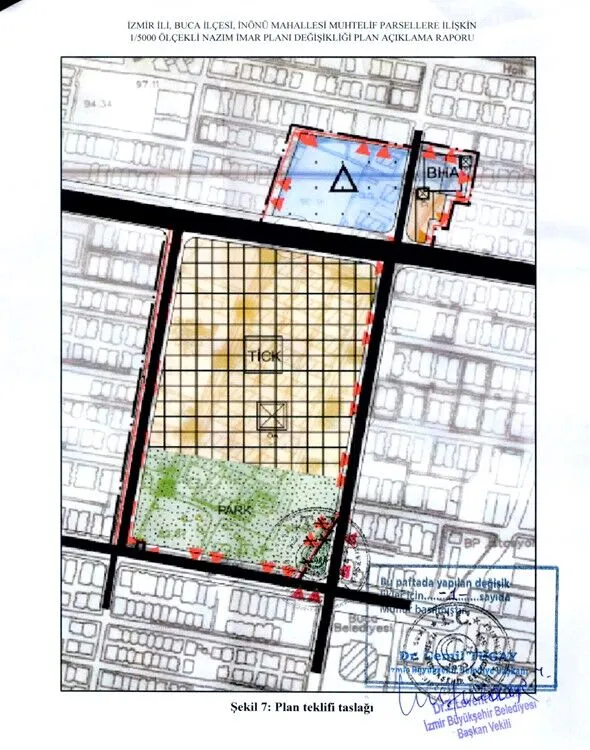 “Planlama alanı; İzmir İli, Buca İlçesi, İnönü Mahallesi’nde bulunan boş arsa olarak bulunan, 1/5000 ölçekli Nazım İmar Planında L18-A14-A paftasında; mülkiyeti büyük oranda İlker Bankası A.Ş.’ne küçük miktarda İzmir Büyükşehir Belediyesi hisseleri ile İnönü Mahallesi 673 ada 12, 101, 166, 171, 172, 173, 175, 177, 190, 202, 213, 222 parseller, 7299 ada 27 ve 35 parseller, 7240 ada 1, 2, 3, 31 ve 32 parselleri kapsamaktadır. İzmir İli, Buca İlçesi, İnönü Mahallesi, Eski Çevreyolu güneyinde kalan; 673 ada 12, 101, 166, 171, 172, 173, 175, 177, 190, 202, 213, 222 parseller, 7299 ada 27 ve 35 parseller, 7240 ada 1, 2, 3, 31 ve 32 parsellerin; “Ticaret + Konut Alanı, E:1.50, Hmax: Serbest, E:1.50 yapılaşma koşullarında (yaklaşık 45.500 m² ticaret alanı ve 45.500 m² konut alanı olmak üzere toplam 91.000 m² inşaat alanı)” kullanım koşullarında hazırlanacak imar planı teklifi ile planlanmasına, İzmir Büyükşehir Belediye Meclisi ve ilçe belediyesince onaylanması şartıyla söz konusu alanda bu planlama çalışması ile planlama alanının güneybatısında yer alan ve yasal durum itibariyle konut alanı miktarının üzerinde 16.500 m² inşaat alanı planlanmış, İzmir Büyükşehir Belediyesi’nce planlanan ve önceki (mahkeme kararı ile iptal edilen) planda yer alan eğitim alanı ve belediye hizmet alanı plan kararları iş bu planlama çalışmasında değerlendirilmiştir.”