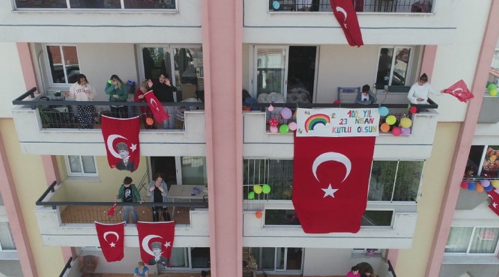 Gün boyu Buca’nın tamamını dolaşarak çocukların coşkusuna ortak olan kortej, belli noktalarda durarak balkonlardaki vatandaşlarla birlikte şarkılar söyledi. Yasak gereği evlerinden çıkamayan çocuklara ise belediye tarafından hazırlanan bayraklar dağıtıldı. Bayraklar, drone ile havalandırılarak balkonlardan evlere gönderildi.