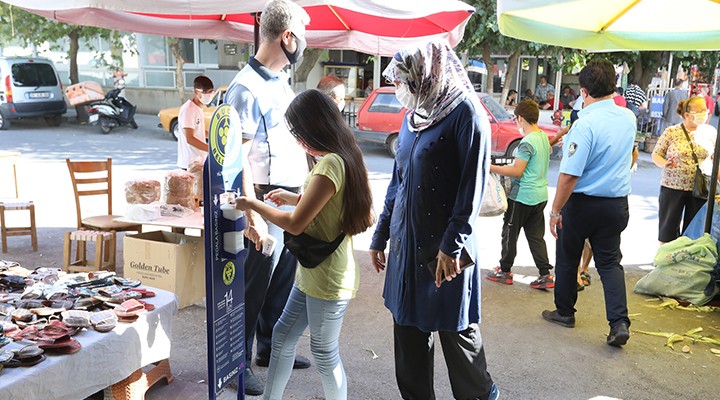 Virüsün bulaşma riskini en aza indirmek için semt pazarı girişlerinde ateş ölçümü gerçekleştiren Buca Belediyesi , vatandaşları , pazar giriş noktalarına yerleştirilen dezenfektan ünitelerinde ellerini dezenfekte ettikten sonra alışveriş yapmaları konusunda düzenli olarak uyarıyor.