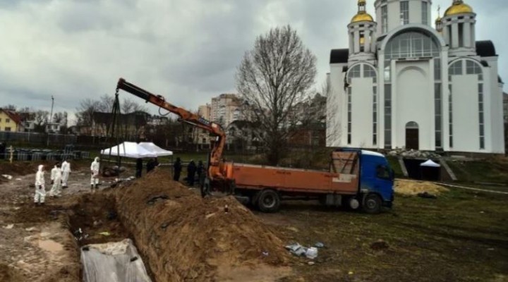Rusya'nın Ukrayna'da saldırıları sürerken, Ukrayna'nın Kiev bölgesinde yer alan Bucha kentindeki kilisenin bahçesinde bulunan toplu mezardan cesetler çıkartılmaya devam ediyor.