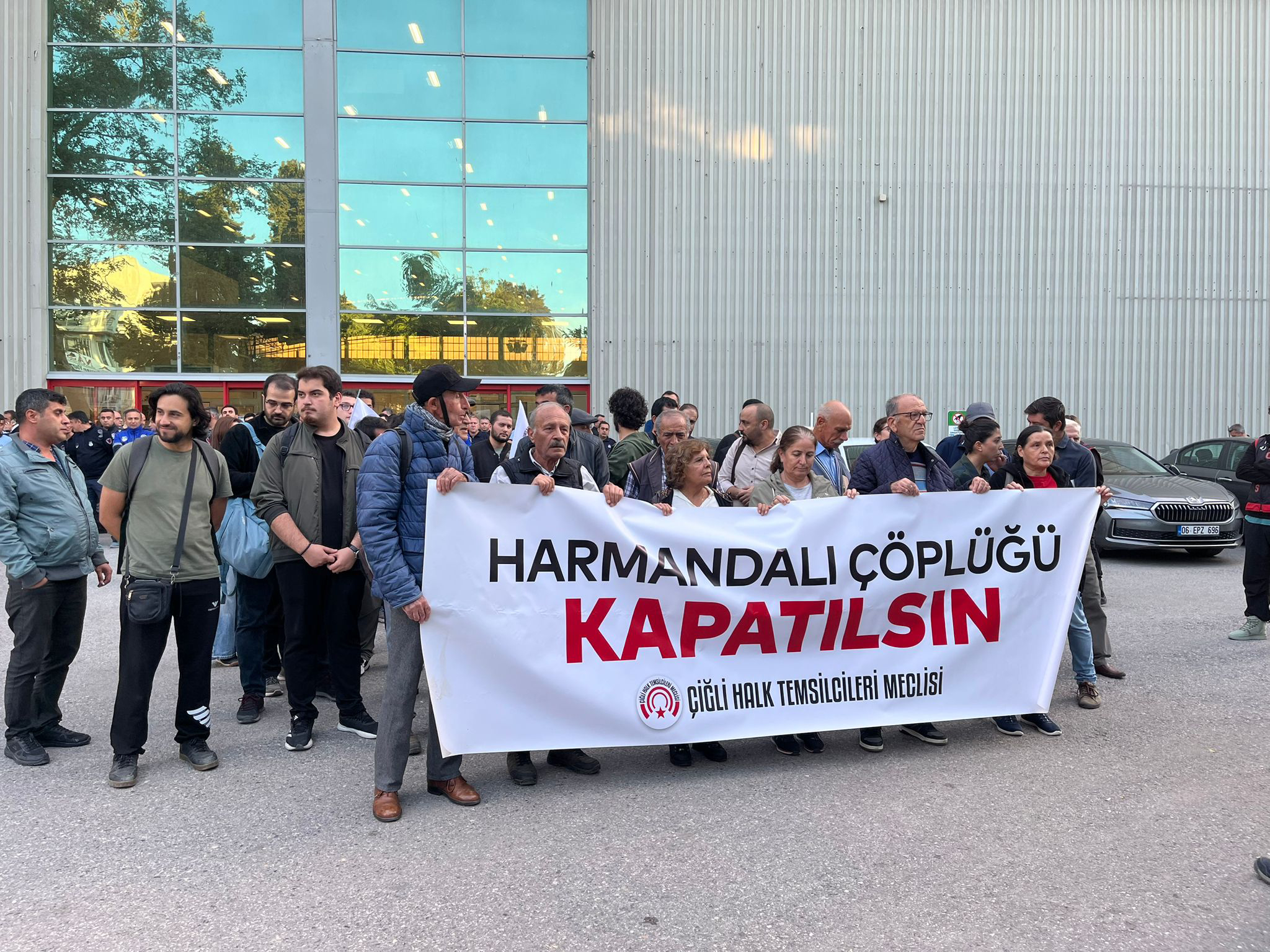 Çiğli Halk Temsilcileri Meclisi, Harmandalı Atık Depolama Tesisi'nin geçici süre ile yeniden faaliyete geçmesi kararını İzmir Büyükşehir Belediye Meclisi önünde protesto etti. Meclis önüne çöp torbaları getiren grup basın açıklaması yaptı. Yaklaşık bin yurttaşın Harmandalı'nın kapatılması için başlatılan imza kampanyasına destek verdiği belirtildi.