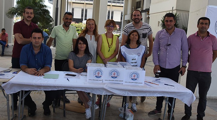 İzmir Büyükşehir Belediyesi'nde çalışan 5 bin 760 kamu emekçisini ilgilendiren toplu iş sözleşmesi görüşmeleri devam ediyor. Memurların örgütlü bulunduğu Kamu Emekçileri Sendikaları Konfederasyonu'na (KESK) bağlı Tüm Belediye ve Yerel Yönetim Hizmetleri Emekçileri Sendikası (Tüm Bel-Sen) İzmir 1 No'lu Şube, taslakta yer alan 6 maddenin üyelerce oylanması için referandum yapma kararı aldı. İzmir Büyükşehir Belediyesi ana binası, İZSU, ESHOT, zabıta, Eşrefpaşa Hastanesi'nin de içinde bulunduğu 10 birimde sandık kuruldu. Memurlar, üzerinde 'kabul' veya 'ret' yazılı kağıtları, şeffaf sandıklara attı. Şube Başkanı Anıl Kaçar, oylamaya sundukları maddeler hakkında bilgi verdi. Kaçar, şu anda net 1054 TL olarak ödenen sosyal denge tazminatının aylık brüt 1882 TL, net 1600 TL olması yönündeki maddenin yanı sıra 1 Mayıs ve 29 Ekim'de net 750 TL, Kurban Bayramı'nda da net bin TL'lik 3 ikramiye verilmesi maddelerinin oylandığını kaydetti. Kaçar, "Temel derdimiz, herkesin dahil olabildiği bir sözleşme çıkarmak. Sürecin başında 'Söz, karar emekçilerde' demiştik. Bunu gerçekleştirmek istiyoruz" diye konuştu.