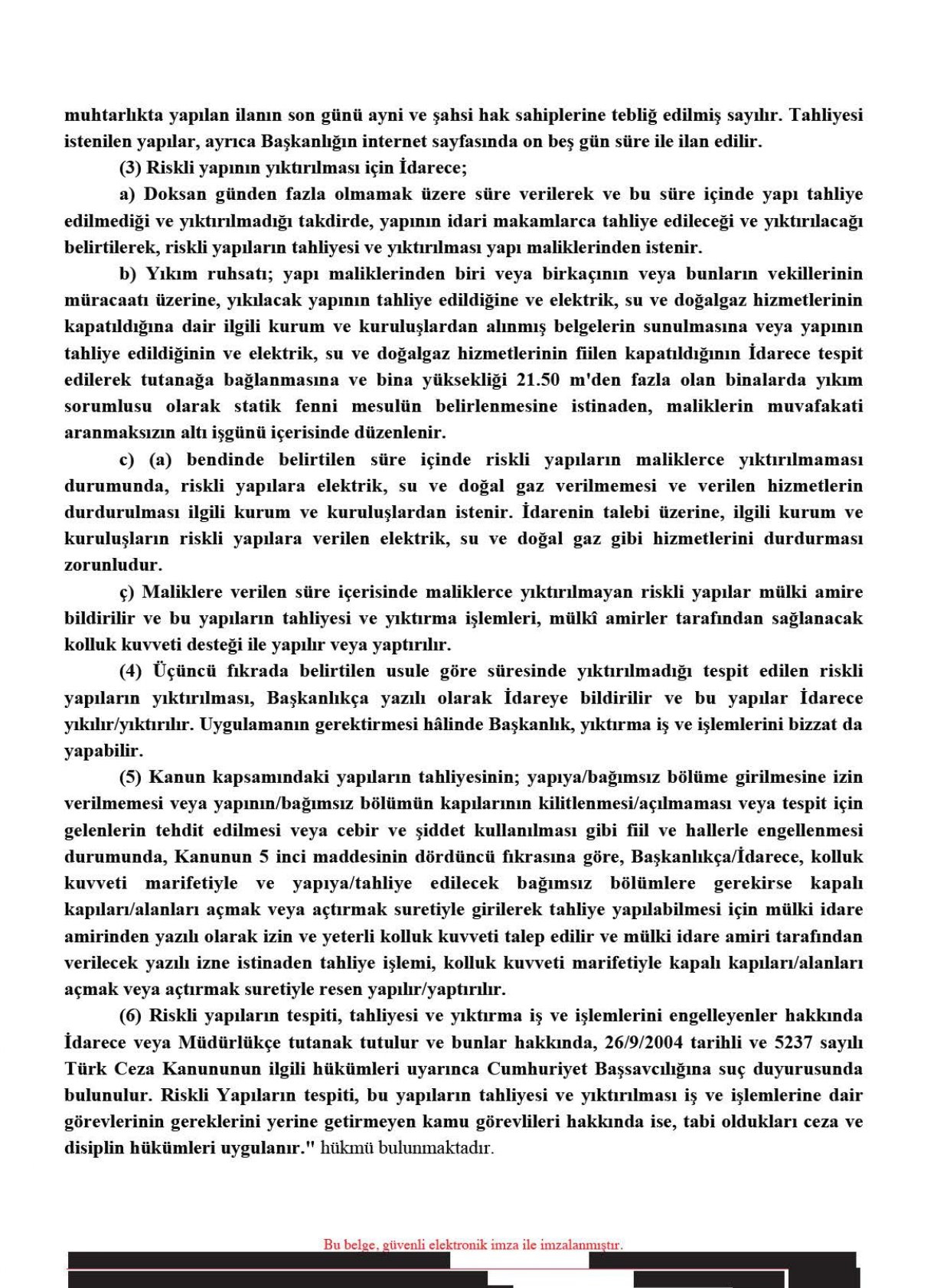 6306 Sayılı Kanun ve uygulama yönetmeliği kapsamında riskli yapı kararı kesinleştikten sonra maliklerce yapının yıkımı yerine güçlendirilmesi yönünde karar alınsa dahi gerek can ve mal güvenliği yönünden gerekse de yasal olarak yapının tahliye edilmesinin zorunluluğu tartışmasızdır. Ayrıca riskli yapının tapu kaydında yer alan “riskli yapı şerhi” yapı yıkıldıktan veya güçlendirildikten sonra kaldırılmaktadır. Bu doğrultuda yapının güçlendirilip ruhsat işlemleri tamamlandıktan ve tapudaki şerhin terkininden sonra kullanıma açılacağı da 6306 sayılı kanunda hüküm altına alınmıştır.