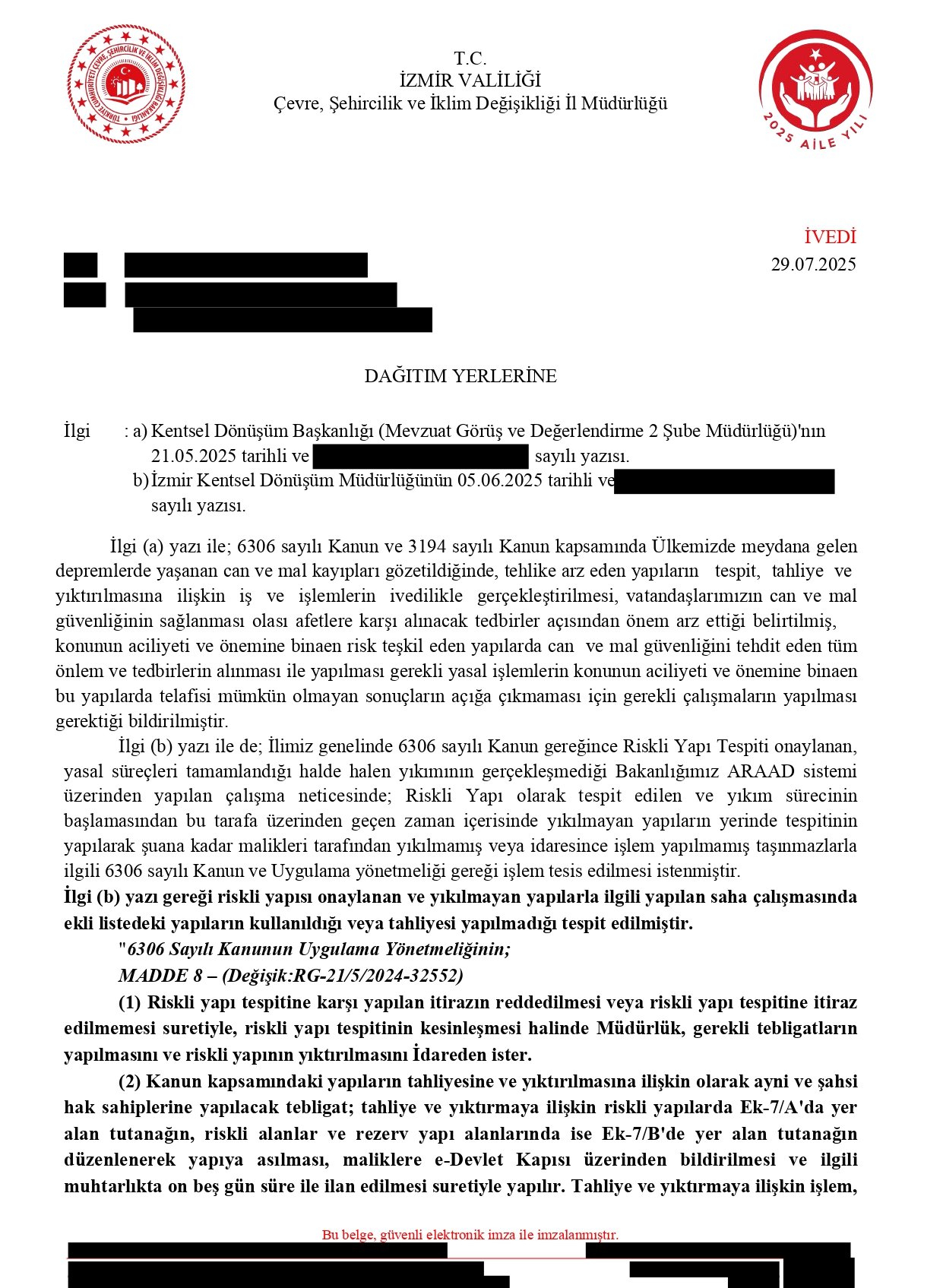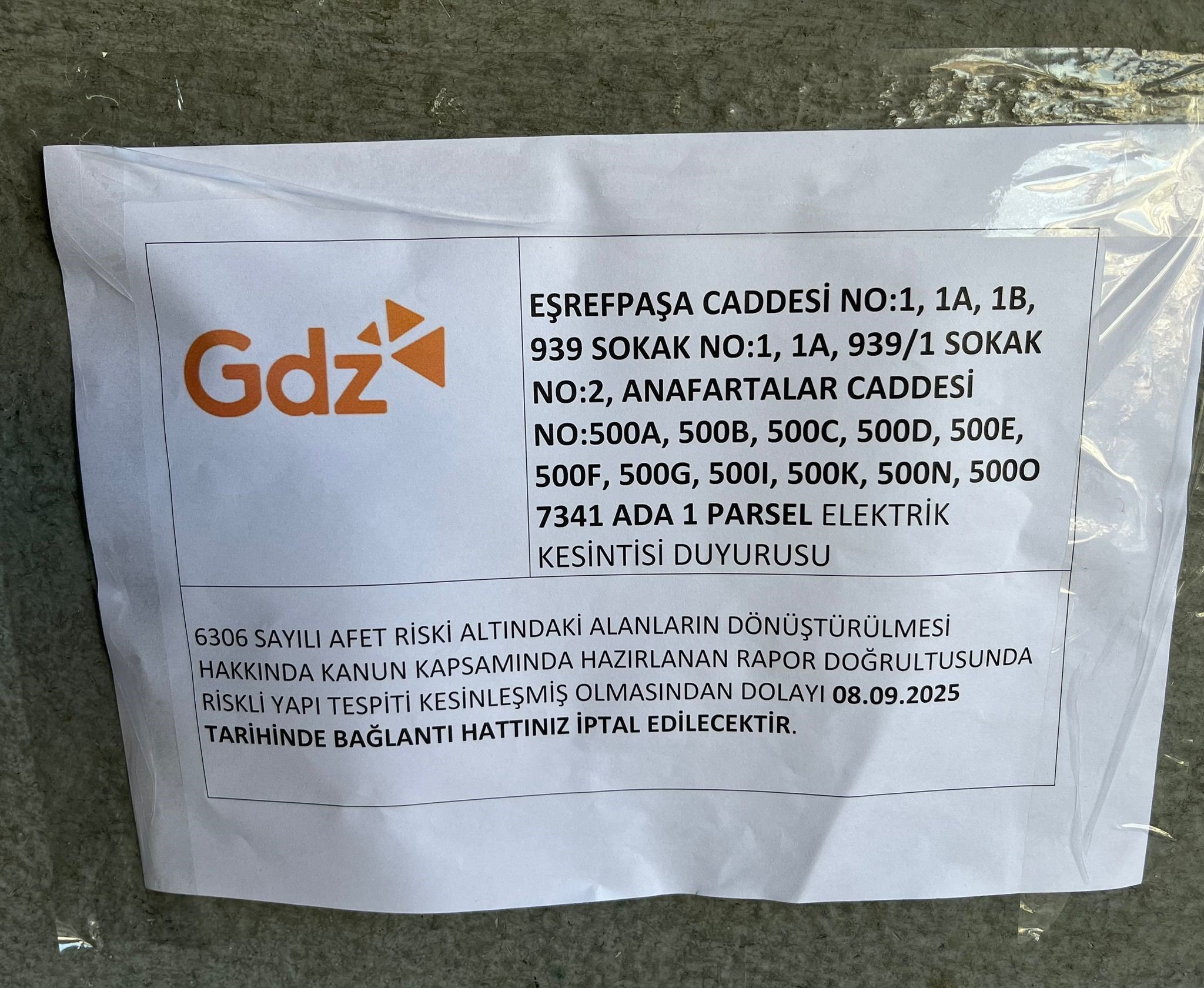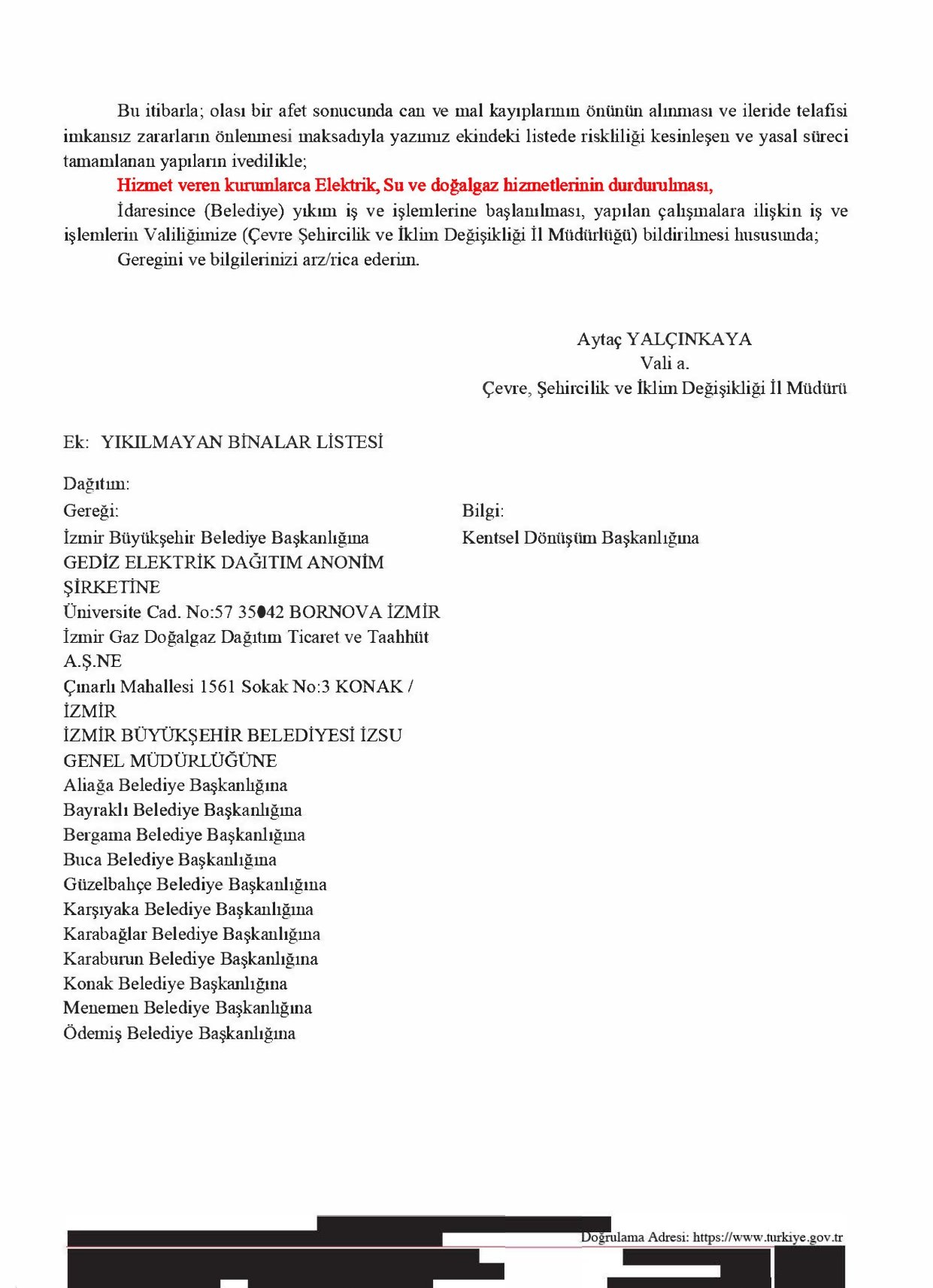 Sonraki aşamada ise Çevre, Şehircilik ve İklim Değişikliği İzmir İl Müdürlüğü’nün 29.07.2025 tarihli yazısı ile söz konusu taşınmazın ilgili kurumlarca elektrik, su ve doğal gaz hizmetlerinin durdurulması ve yıkım işlemlerine başlanılması gerektiği bildirilmiştir. Bu kapsamda GDZ Elektrik Dağıtım AŞ tarafından yapıya bağlantı hattının 08.09.2025 tarihinde iptal edileceği duyurusu asılmıştır.