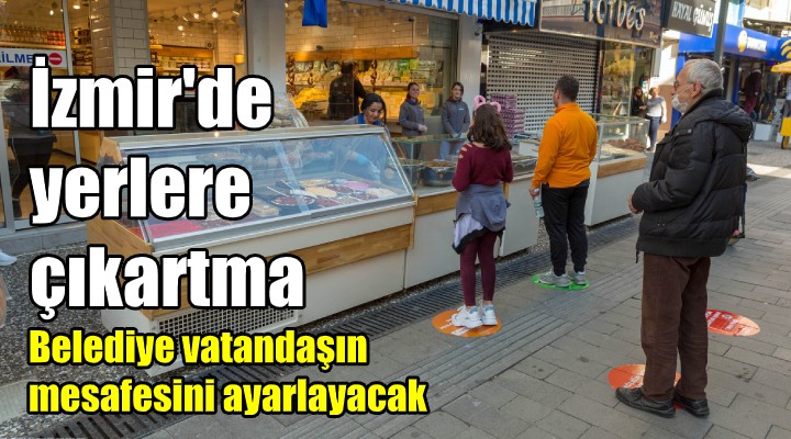İzmir Büyükşehir Belediyesi koronavirüs salgınına karşı sosyal mesafeyi hatırlatan zemin çıkartmaları hazırladı. Koronavirüs bulas?ma riskini azaltmak amacıyla insanların birbirlerinden en az 1 metre uzakta durması gerektiğini hatırlatan zemin çıkartmaları, kent genelinde yapıştırılmaya başlandı. Sıraya giren insanlar çıkartmaların üzerinde duracak, bu sayede ön ve arkalarındaki insanlarla aralarında 1 metre mesafe bırakmış olacak.