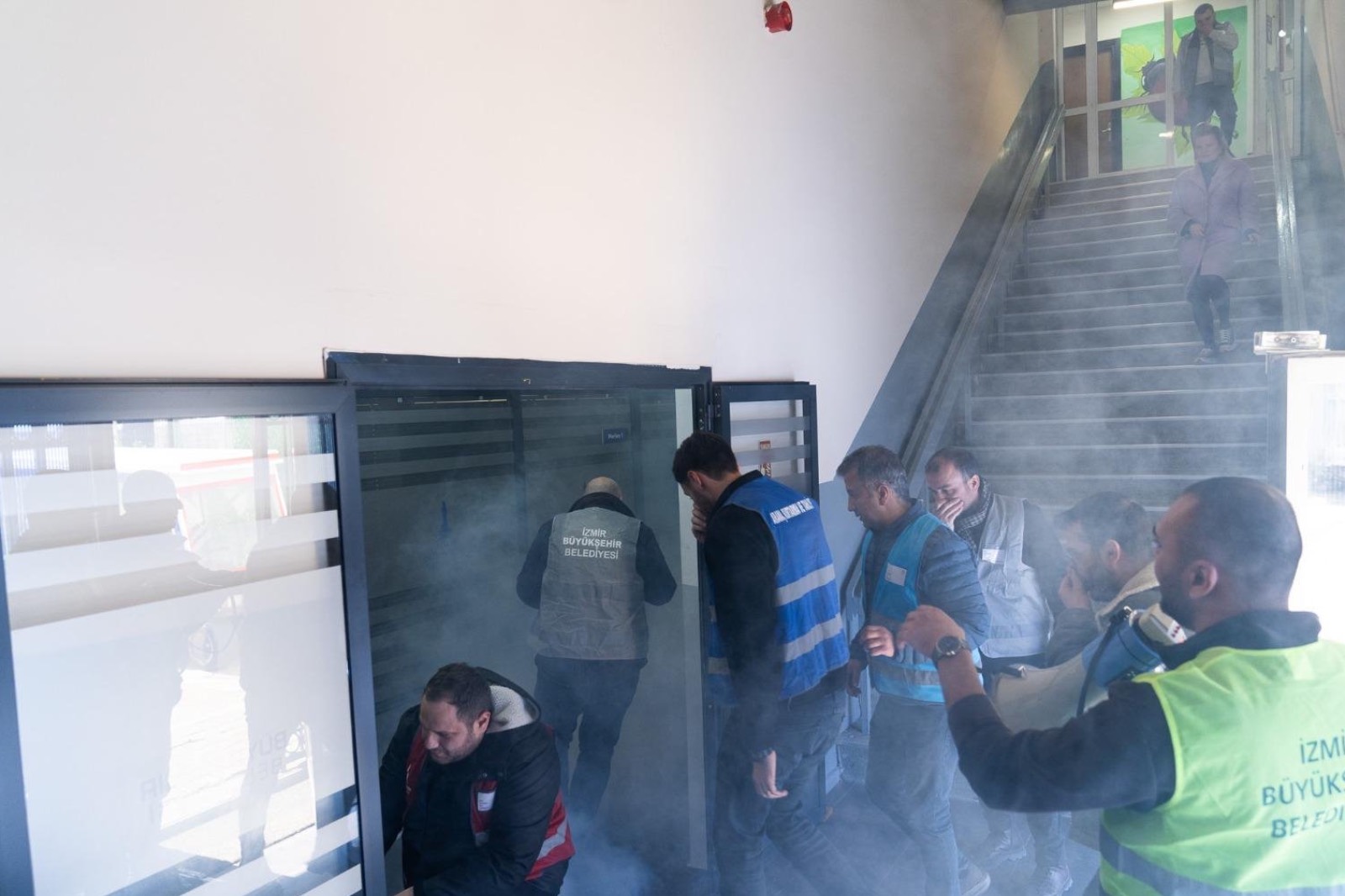 112 Acil Çağrı Merkezi’ne bilgi verilirken, yangın söndürme ekibi taşınabilir tüplerle ilk müdahaleyi gerçekleştirdi. Anons sistemi üzerinden yapılan tahliye çağrısının ardından kat görevlileri personeli acil çıkışlara yönlendirdi. Engelli ve özel durumu bulunan çalışanlar destek ekipleri eşliğinde güvenli şekilde binadan çıkarıldı.