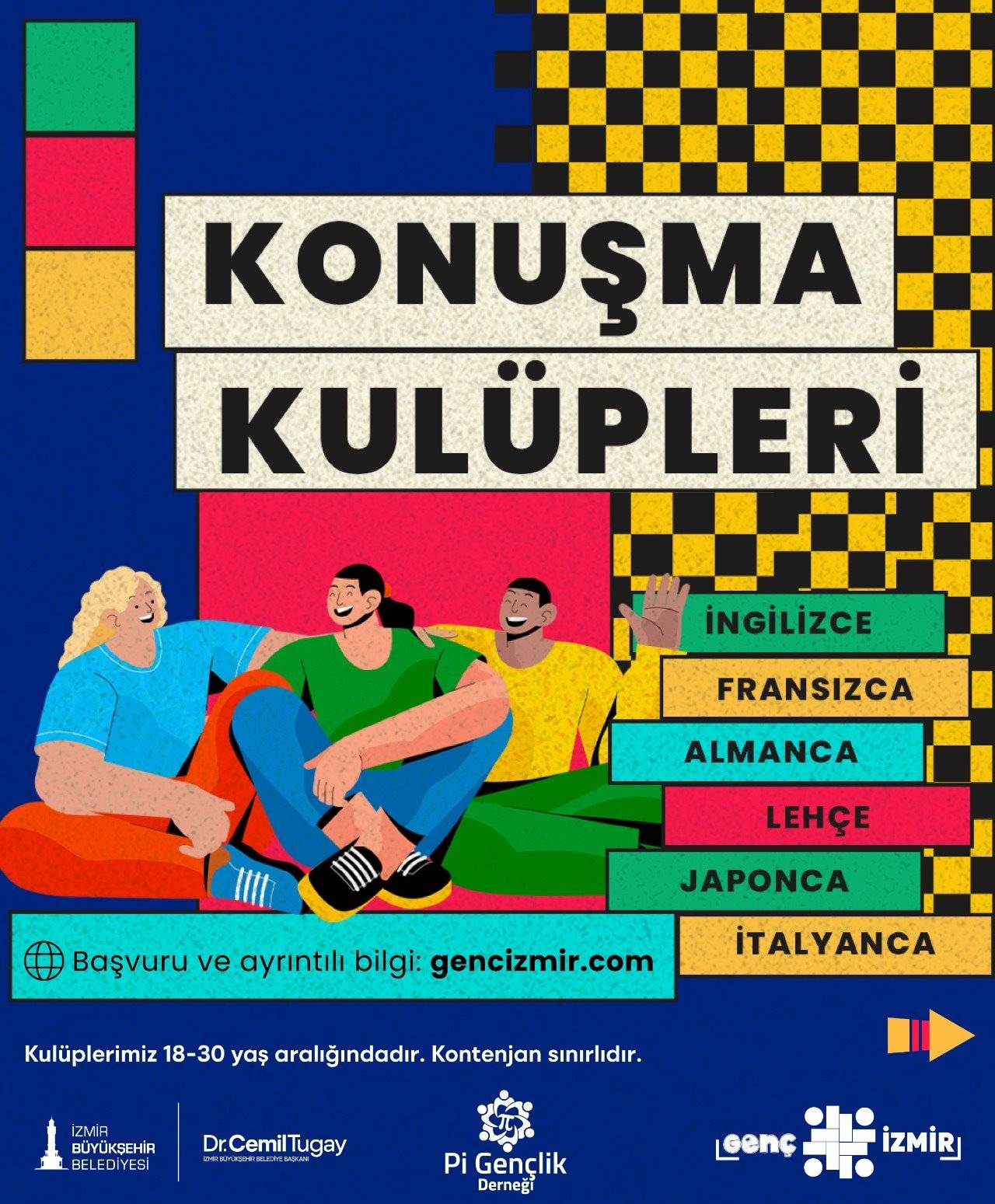 Çiğli Gençlik Merkezi’nde İngilizce, İtalyanca, Fransızca, Lehçe, Almanca konuşma kulüpleri olacak. Bornova Aşık Veysel Gençlik Merkezi, Bornova Macera Parkı Gençlik Merkezi, Alsancak Talatpaşa Gençlik Merkezi, Şato İzmirli Kahve ve Buca Kasaplar Meydanı İzmirli Kahve’de İngilizce Konuşma Kulüpleri düzenlenecek. Kurslar ve konuşma kulüpleri önümüzdeki hafta başlayacak. Başvurular gencizmir.com üzerinden yapılabilecek.