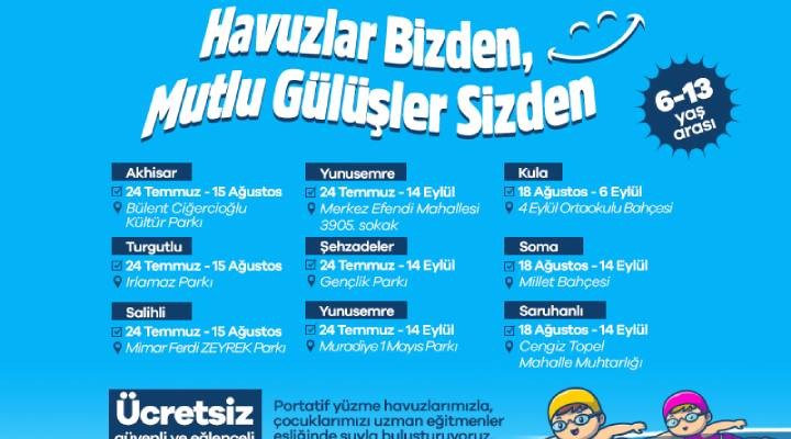 Portatif havuzlar; Akhisar Bülent Ciğercioğlu Kültür Parkı’nda 24 Temmuz- 15 Ağustos, Turgutlu Irlamaz Parkı’nda 24 Temmuz- 15 Ağustos, Salihli Mimar Ferdi Zeyrek Parkı’nda 24 Temmuz- 15 Ağustos, Yunusemre Merkez Efendi Mahallesi 3905 Sokak’ta 24 Temmuz- 14 Eylül, Şehzadeler Gençlik Parkı’nda 24 Temmuz- 14 Eylül, Yunusemre Muradiye 1 Mayıs Parkı’nda 24 Temmuz- 14 Eylül, Kula 4 Eylül Ortaokulu Bahçesi’nde 18 Ağustos-6 Eylül, Soma Millet Bahçesi’nde 18 Ağustos- 14 Eylül, Saruhanlı Cengiz Topel Mahalle Muhtarlığı önünde 18 Ağustos-14 Eylül tarihleri arasında hizmet verecek.