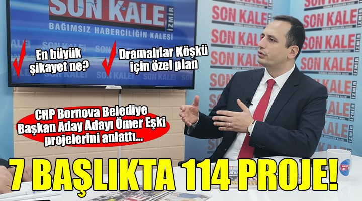 SONKALEİZMİR-SONKALE TV'de gazeteci Mustafa Akbaş'ın sorularını yanıtlayan CHP Bornova Belediye Başkan Aday Adayı Ömer Eşki, 31 Mart Yerel Seçimleri öncesi çalışmalarını anlattı. Bornova Belediyesi'nin son 20 yılına hakim olduğunu ve sorunları çok iyi bildiğini dile getiren Eşki, 7 başlık altında 114 projeyi hayata geçireceklerini söyledi.