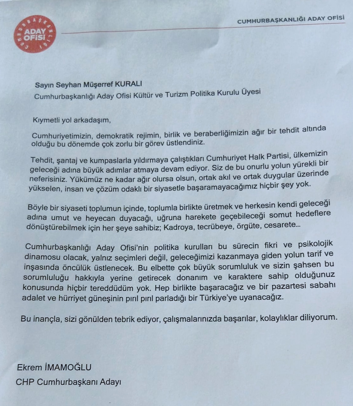 SONKALEİZMİR-İzmir Büyükşehir Belediyesi ve Menderes Belediyesi Meclis Üyesi Seyhan Müşerref Kuralı, CHP İzmir Milletvekili Seda Kaya Ösen'in başkanlığını yürüttüğü CHP'nin Cumhurbaşkanlığı Aday Ofisi Kültür ve Turizm Politika Kurulu'nda görevlendirildi. Kuralı'ya CHP Genel Başkanı Özgür Özel ve CHP'nin Cumhurbaşkanı Adayı tutuklu İstanbul Büyükşehir Belediye Başkanı Ekrem İmamoğlu tarafından görev tebliği yapıldı.