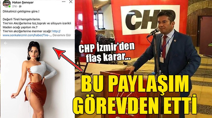 SONKALEİZMİR-CHP İzmir İl Başkanlığı, sonkaleizmir.com'un "Tire'nin akciğerlerine mermer ocağı" başlığıyla verdiği haberi sosyal medya hesabından bir kadın görseli ile paylaşan Tire İlçe Başkanı Hakan Şenoyar'ı görevden aldı.