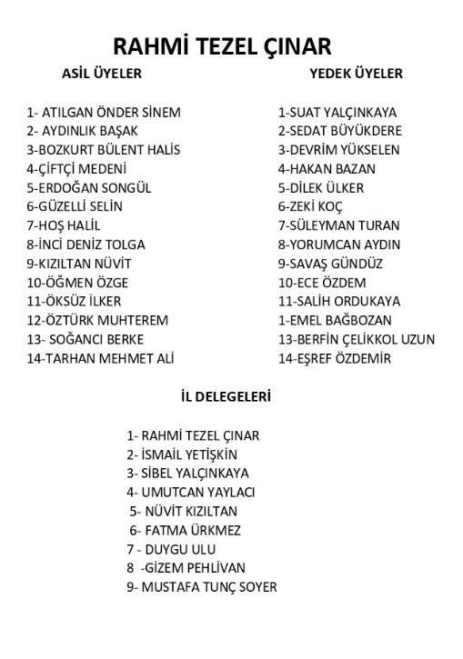 SONKALEİZMİR-Seferihisar Belediyesi Düğün Salonu'nda yapılan kongreye Seferihisar Belediye Başkanı İsmail Yetişkin, CHP İzmir milletvekilleri Ednan Arslan ve Seda Kaya Ösen'in yanı sıra Eski CHP İzmir İl Başkanı Alaattin Yüksel, CHP İzmir il yöneticileri katıldı. Kongreye tek aday olarak giren mevcut başkan Rahmi Tezel Çınar 170 oyla yeniden başkan seçildi. Çınar'ın il delege listesinde tutuklu Eski İzmir Büyükşehir Belediye Başkanı Tunç Soyer de yer aldı. Çınar'ın yönetim listesi şöyle: