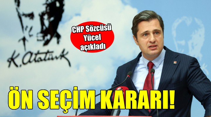 CHP Parti Sözcüsü ve İzmir milletvekili Deniz Yücel, Parti Meclisi toplantısı sonrası genel merkezde basın toplantısı düzenledi. Yerel seçim öncesi adayların belirlenmesi sürecine değinen Yücel, "Ön seçim" kararını açıkladı. Yücel şunları söyledi: