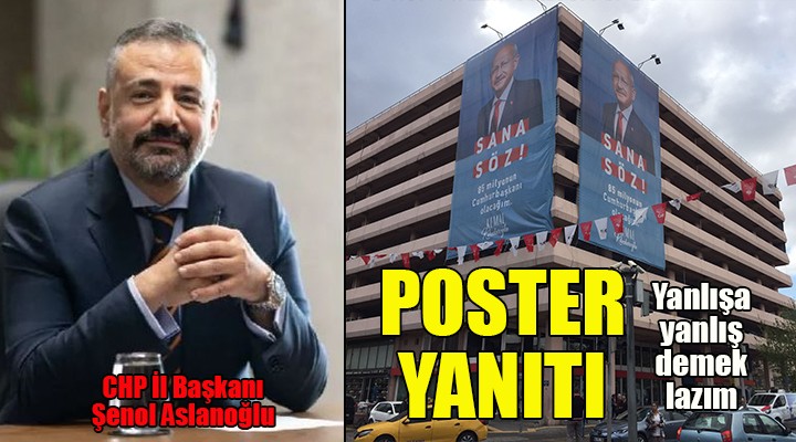 Sosyal medya hesabından Hızal'ın paylaşımının altına bir açıklama yapan CHP İl Başkanı Aslanoğlu, "Yanlışa yanlış demek lazım.. Reklam firmasının hatası, sabah erken saatlerde talimat verdim sökülüyor. Özgür beyin paylaşımıyla bir kez daha ortaya çıktı ki, yanlış saat bile günde iki kez doğruyu gösteriyormuş" ifadelerini kullandı.