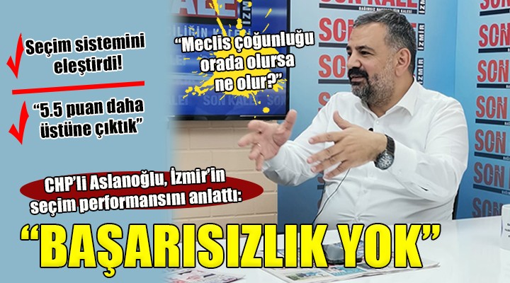 D'Hondt sisteminin sonuçları olumsuz etkilediğini vurgulayan Aslanoğlu, "Bu sistemde milletvekillikleri 1000- 2000 bin oyla değişir. Bu başarı ya da başarısızlığın çok büyük bir ölçütü değildir. Hiçbir şekilde değildir. Asıl başarısızlık aldığın oy oranıdır. CHP İzmir'in yaptırdığı anket sonuçlarına göre, 8+8 çıkıyordu. 9'lar izin zorlamamız lazımdı. Doğal olarak bir parti il başkanı olarak daha yükseği hedef olarak konur. Örgütleri motive etmek, teşvik etmek için... Diyelim ki biz bu seçimde biraz daha düşük oy alsaydık. Mesela, İYİ Parti 2000 oy daha fazla alsaydı, TİP 4500-5000 oy daha fazla alsaydı bu durumda bizim 1 milletvekilimiz azalırdı. Yani biz 7500 oyu aldığımız için dünyanın en başarısız ili mi olacaktık. Bu sistem buna müsait. İYİ Parti itirazlar nedeniyle arıyor şimdi 2000 oy... Bulursa MHP hiç milletvekili çıkaramaz. Şimdi MHP 1 milletvekili çıkardı başarılı veya İYİ Parti itiraz edip bunu düşürdüğünde, TİP 4500-5000'ini bulduğunda düşürdüğünde MHP'nin başarı ya da başarısızlığı buna göre mi belli olacak. Yoksa MHP'nin aldığı yüzde 5.86'ya göre mi" diye konuştu.