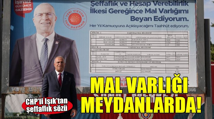 CHP Gaziemir Belediye Başkan Adayı Ünal Işık mal varlığını ilçe bilboadlarından yayınladı. Daha önce lansman toplantısında da mal varlığını duyuran ve başkanlık görev süresi içerisinde makamdan kaynaklı artış olmayacağı sözünü veren Işık, Gaziemir'deki birçok bölgeye afişler de astırdı.